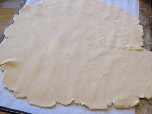 I rolled out my dough directly on a flour-dusted counter top, and then used the rolling pin to move the dough to a piece of parchment on a cookie sheet. Oops, it cracked a little bit. No big deal, though. It’s going to be covered in sauce anyway, right?