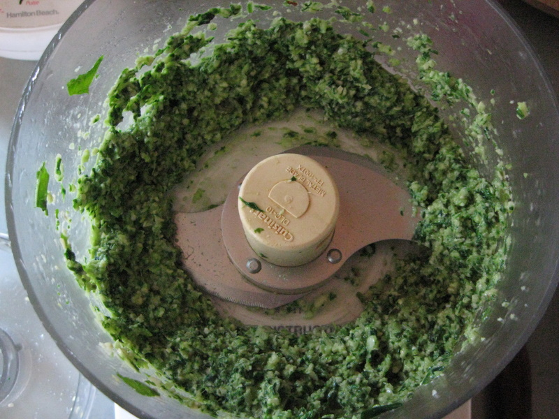 Bring a large pot of water to a rapid boil. Drop the ramps in the boiling water for 30 seconds. Remove them and shock them under cold water. (This doesn’t really change the taste, but it does keep the ramps a brighter green. You can skip this step, but you’re going to need a pot of water for the pasta anyway, right?) Place the ramps, 1/2 of the soaked cashews, the basil, the 2 T. olive oil, the lemon juice, the nutritional yeast, and the 1/2 t. salt in the bowl of your food processor. Pulse until mixture is ground, but not until it’s completely smooth. (See picture.)