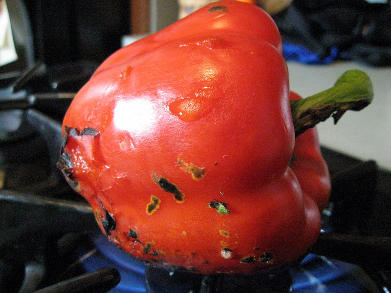 If you’re lucky enough to have a gas stove, you can roast the pepper directly on an open flame. Turn it over an open flame until the skin is blackened all over, then place it in a brown paper bag for about 10 minutes. The steam from the pepper will loosen the skin. You should be able slide all the charred skin right off. Don’t rinse the pepper in water – you’ll lose a lot of the flavor in the oil you wash off.
