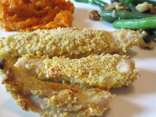 My son is not your typical 7 year old when it comes to food. He has never eaten a hamburger or a hot dog. French fries are not his favorite food group. Vegetable dip? No way. His favorite foods are whole grain cereals, apples with peanut butter, fruit smoothies, and fruit leathers. Notice a pattern? I think the boy could live on sweet carbs. But, that doesn’t mean he isn’t without his salty, crunchy junk food cravings. And his most often requested salty crunchy junk food is chicken fingers. Thankfully, we’ve found a way to make them only slightly indulgent. By using nuts and cornmeal to coat the chicken, we get crunch without any added oil. Yay!