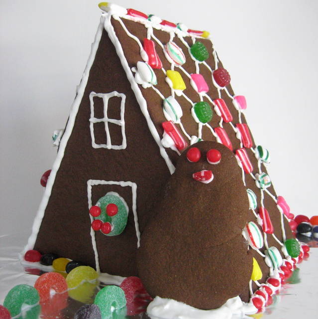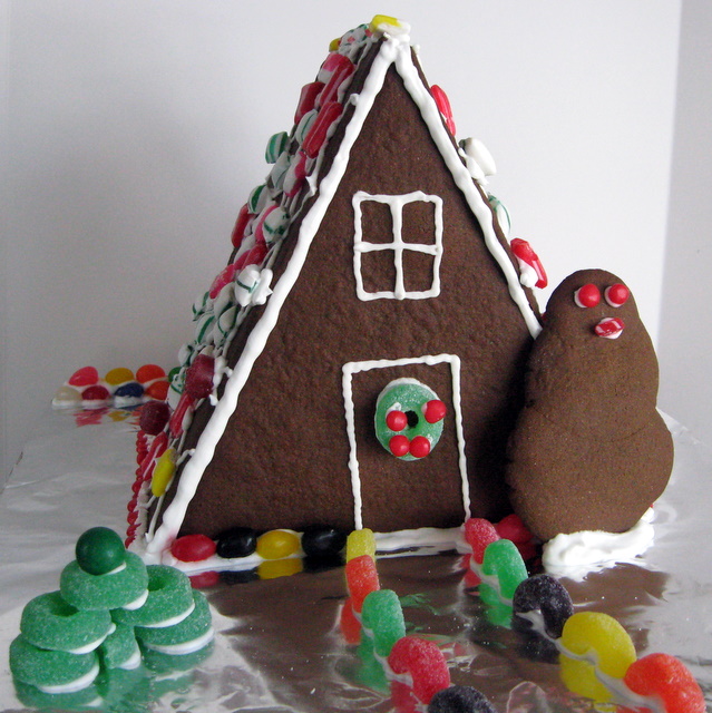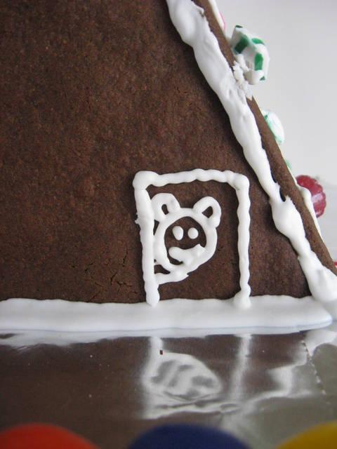 But, whatever the motivation, the kiddo and I had a grand time baking together and creating our first ever gingerbread house. He picked out the design. He helped make the dough. He supervised the rolling and cutting. He designed and created the snowman. (Totally his idea!) He came up with the decoration ideas on the house (based on ones he saw in the books we got from the library). I manned the pastry bag of frosting (it was too hard for him to squeeze it), but I put the frosting where he directed. He applied all the decorations.